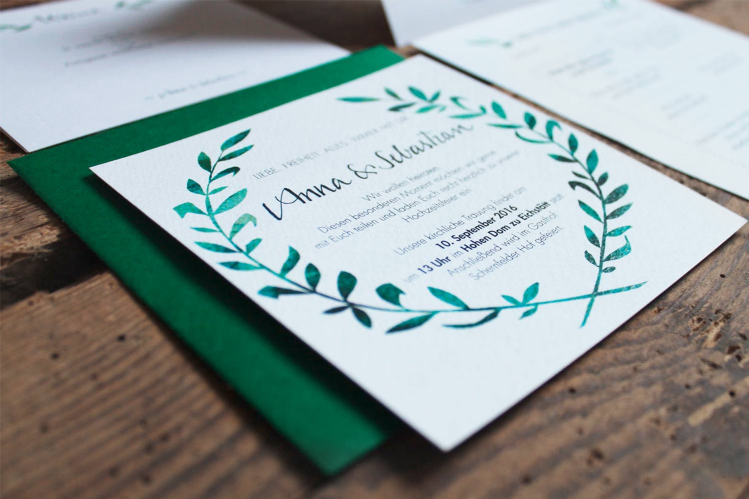 Anna and Sebastian Print products for a wedding including invitation cards, thank you cards, menus, table cards, guest book and a booklet 2016 NächsteTypo St. Gallen – Ein Weißraum, zwei Erinnerungen und dieses Buch